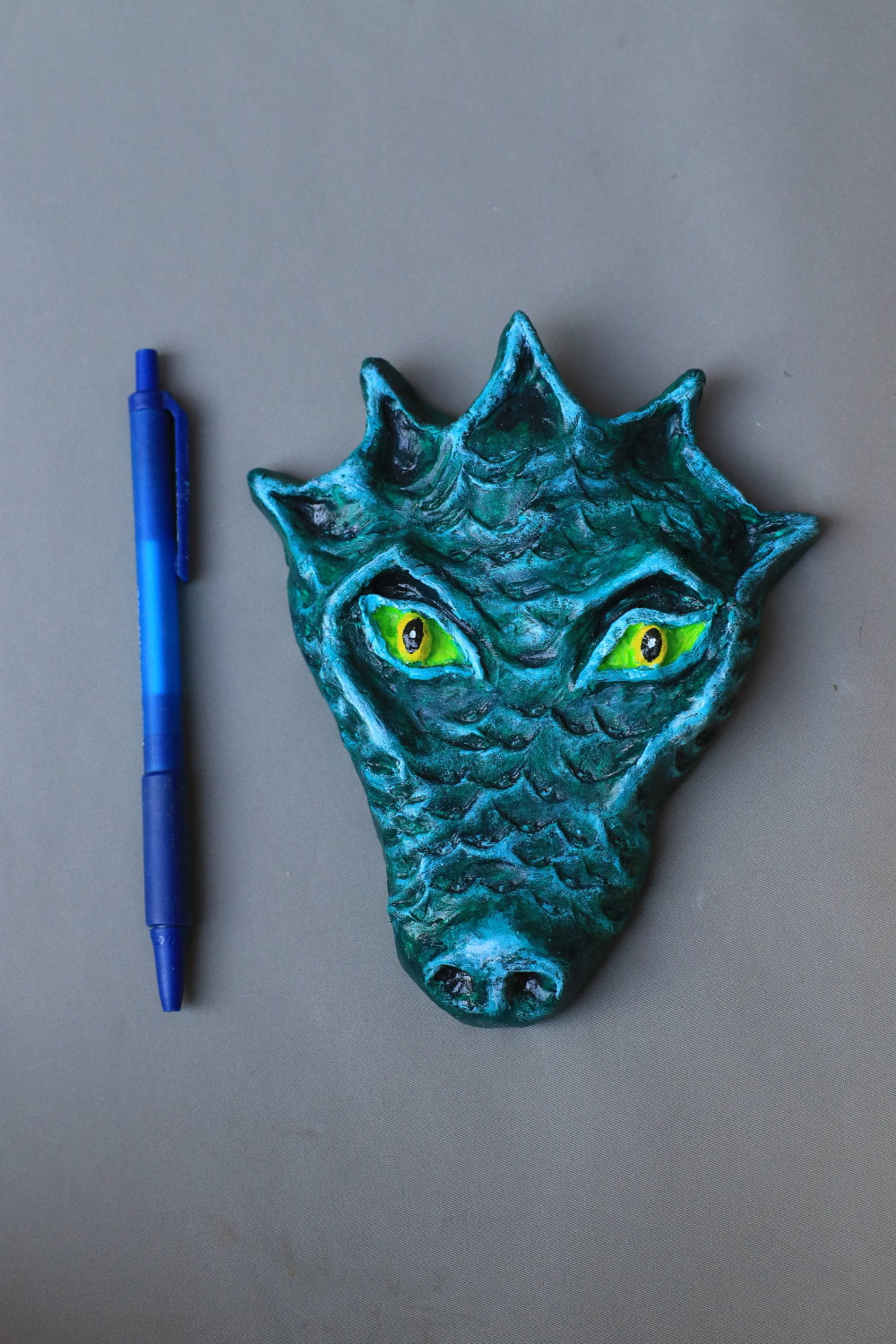 Gemaakt van zelfhardende klei, beschilderd met acrylverf, voorzien van een vernislaag ter bescherming. Achterop zit een haakje waar je het masker mee op kan hangen.