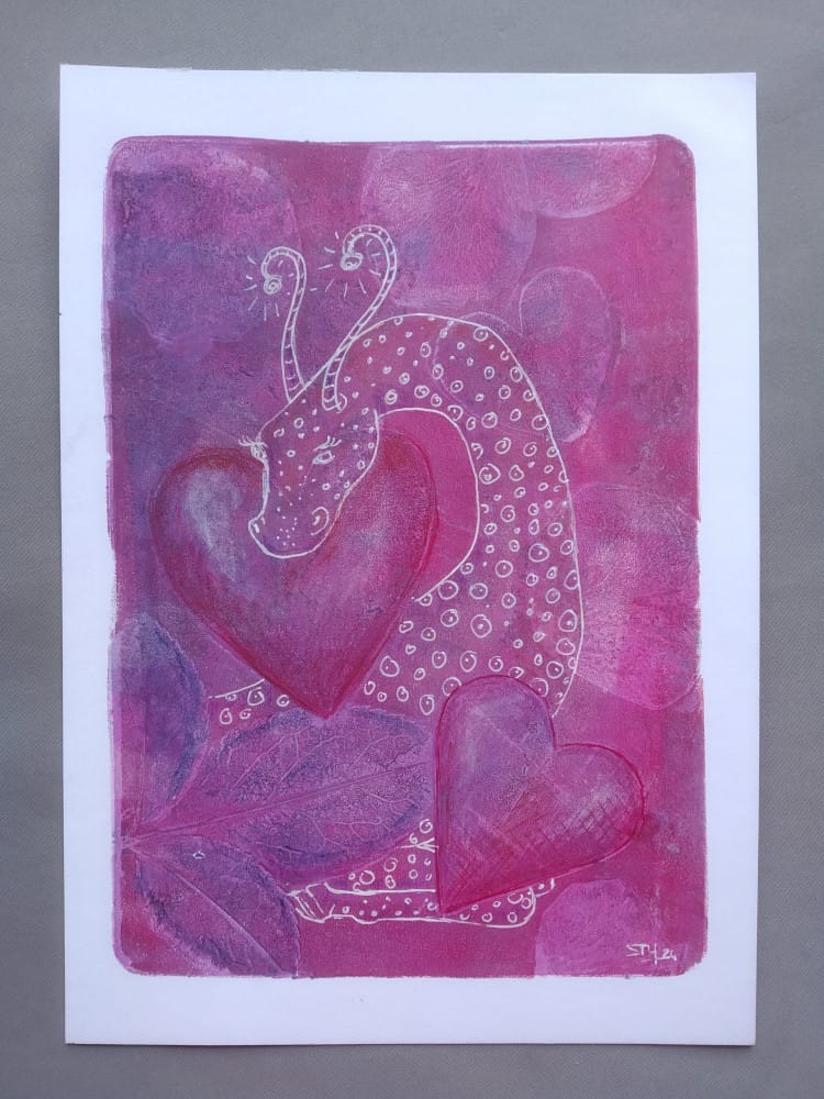 Gelprint, origineel kunstwerk van een roze hartjesdraak, A5 formaat.