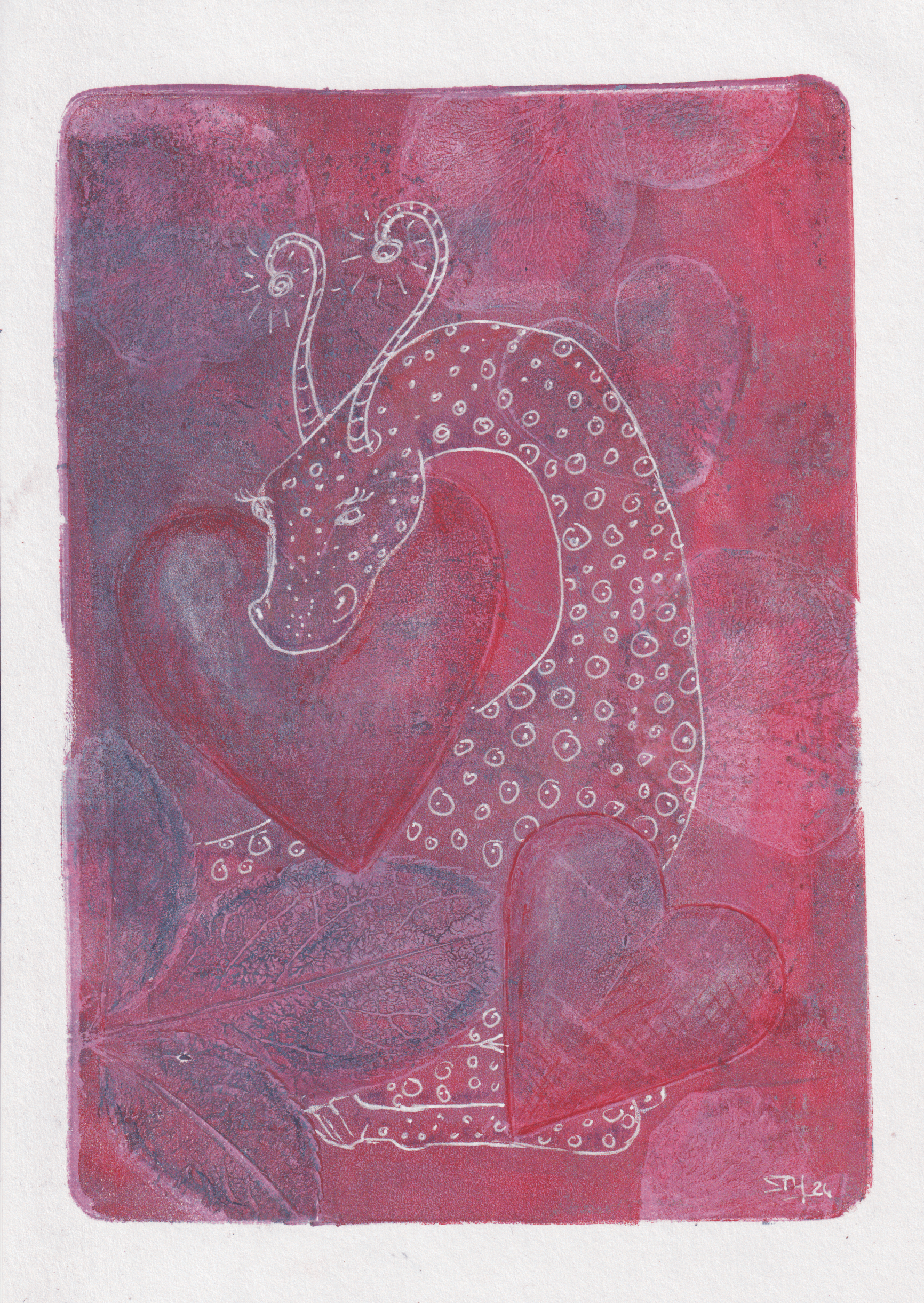Een lieve, speelse, roze hartjesdraak gemaakt met een combinatie van een gelprint met acrylverf, witte gelpen en rode balpen.